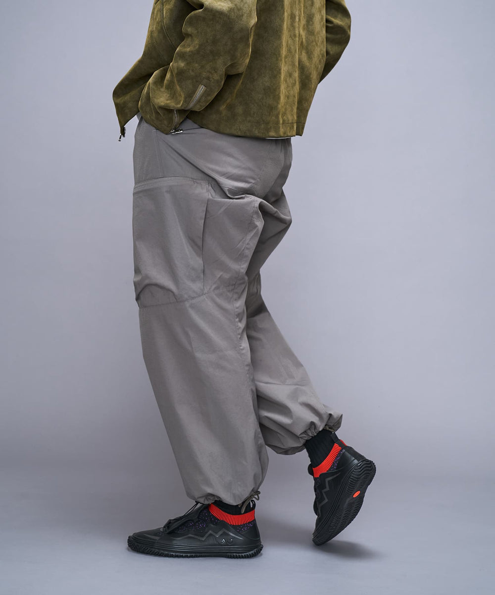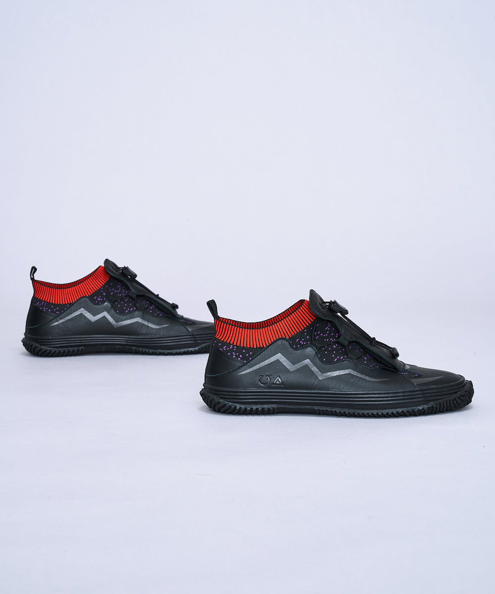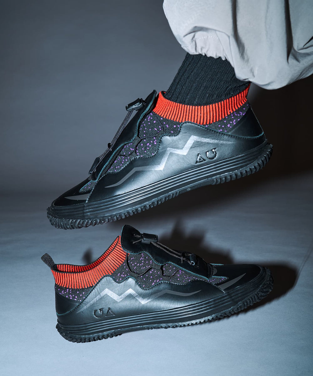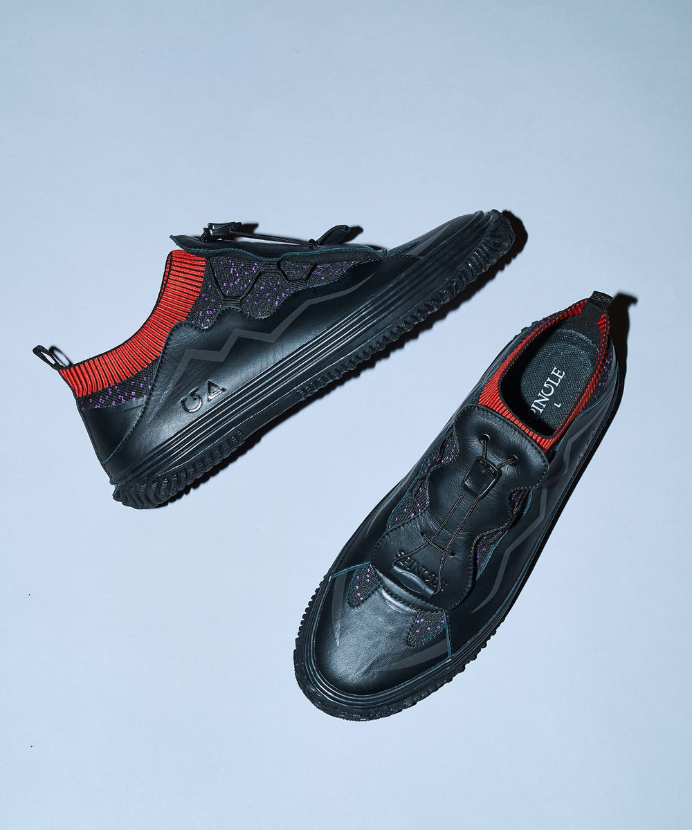 SPINGLE’s iconic wave pattern is featured on the sides, where the leather panel is cut and printed with a wave pattern. The triangular logo, symbolizing the SAC_2045 version of Motoko Kusanagi's cybernetic body design, and the SPINGLE logo are embossed as distinct icons. An embossed SPINGLE logo also adorns the front instep. The fit can be adjusted using drawcords.